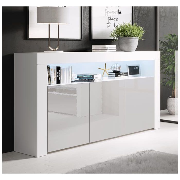 Fabuloso aparador com uma linha moderna, muito elegante e com iluminação LED. Tem três portas e uma área aberta iluminada com luz. A sua grande capacidade é muito útil para armazenar todos os seus objetos volumosos e recuperar espaço na sua sala de jantar.