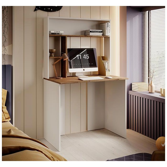 Secretária modelo Pixel com prateleira (90 cm) cor branca e pinho