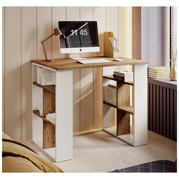 Secretária modelo Urban com prateleiras nos pés cor branca e pinho