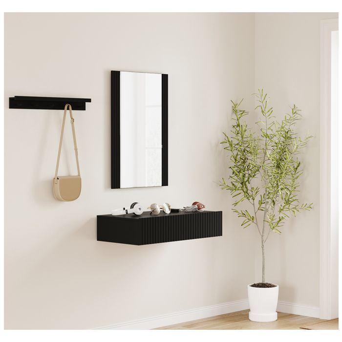 Móvel de entrada Preto canelado com espelho e gaveta Amira