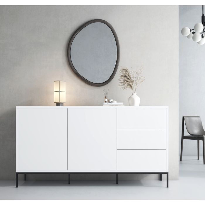 O aparador é entregue desmontado em duas caixas, com ferragens e manual de instruções para uma montagem rápida e fácil.
