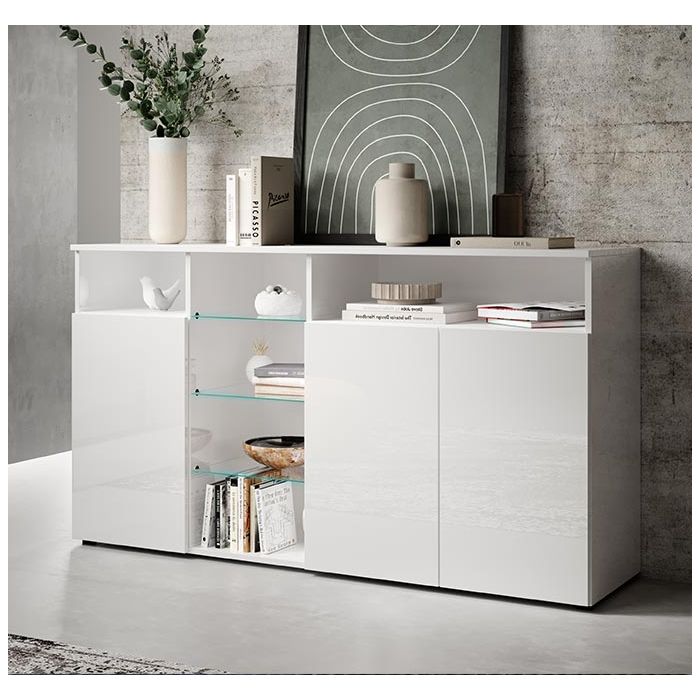 Estrutura e portas com acabamento em melamina brilhantePrateleiras em vidro