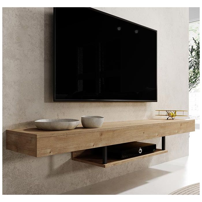 Não ocupa muito espaço e permite colocar os elementos decorativos que desejares destacar, deixando a prateleira flutuante abaixo para players ou componentes eletrônicos.