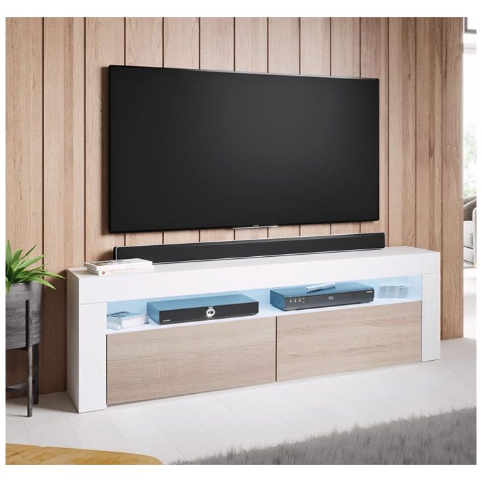 Móvel de TV com 2 portas rebatíveis e 1 compartimento iluminado com luzMateriais do Móvel TV: